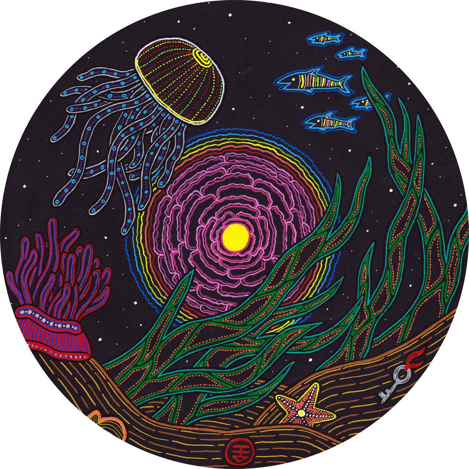 Shapeshifting animals guard the letters. Gifts only, basis for the cocreated Oracle . Paint pens on smaller black circles (20 cm).